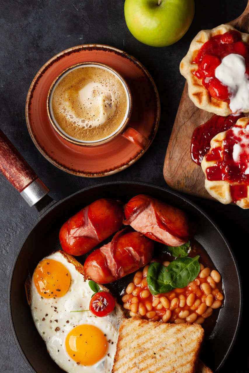 2 Fried Eggs, 2 Sausages, 2 Bacons, 2 Hash Browns, 2 Slices Buttered Toast, Beans, Tomato, Mushrooms